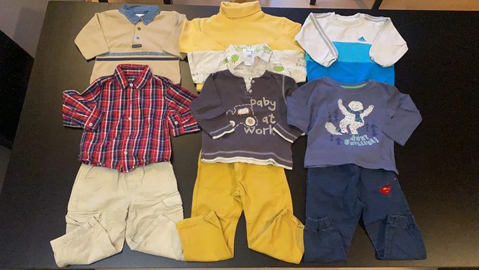 2 pulls, 1 pull polaire a col rouler 2 chemises une manche courte et une manche longue 2 tee shirt manche longue, 3 pantalons