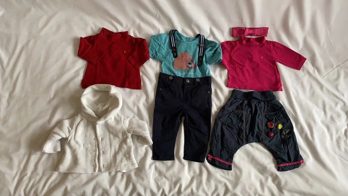 1 tee-shirt rouge manche longue, 1 gilet blanc à capuche, un pantalon bleu marine avec bretelle amovible et tee-shirt manche longue bleu, un bandanna et tee shirt manche longue rose et pantalon bleu marine. En parfait état 3 mois
