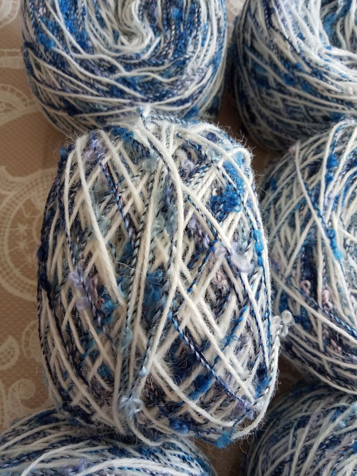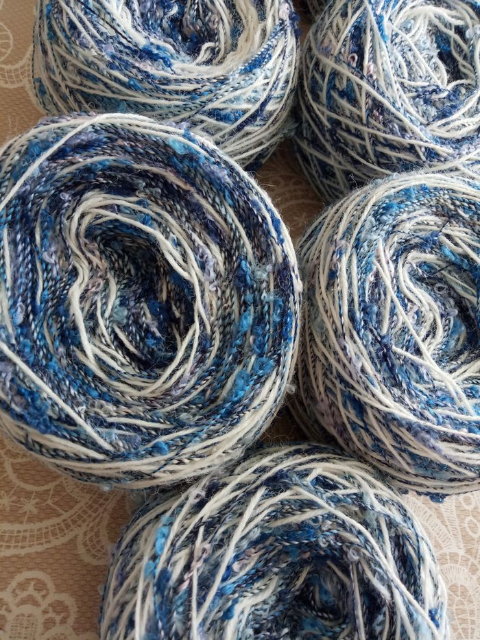 Lot de 7 Pelotes Fantaisies (500g) Couleur: Tons Bleus et Blancs 1 Fil fantaisie très fin + 1 autre simple pas très épais au total 500g Aiguilles N°2-2,5 environ Lot en parfait état