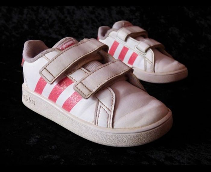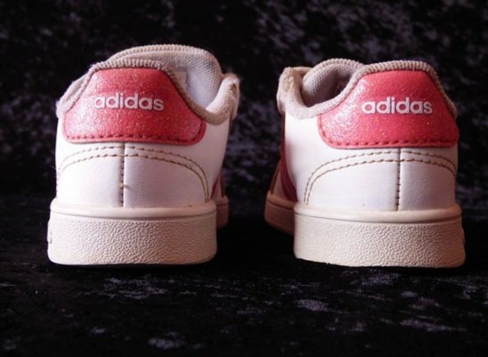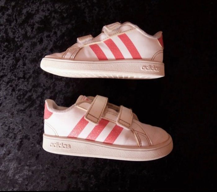 Baskets fille, Grand court i blanc, marque Adidas, dessus en synthétique, doublure textile, semelle intérieure textile, fermeture à scratch, semelle élastomère. 3 bandes pailletées. Quelques traces d'usures, points de coutures cassés sur les scratchs inférieurs ( voir photos ) Mot clé : #sneakers