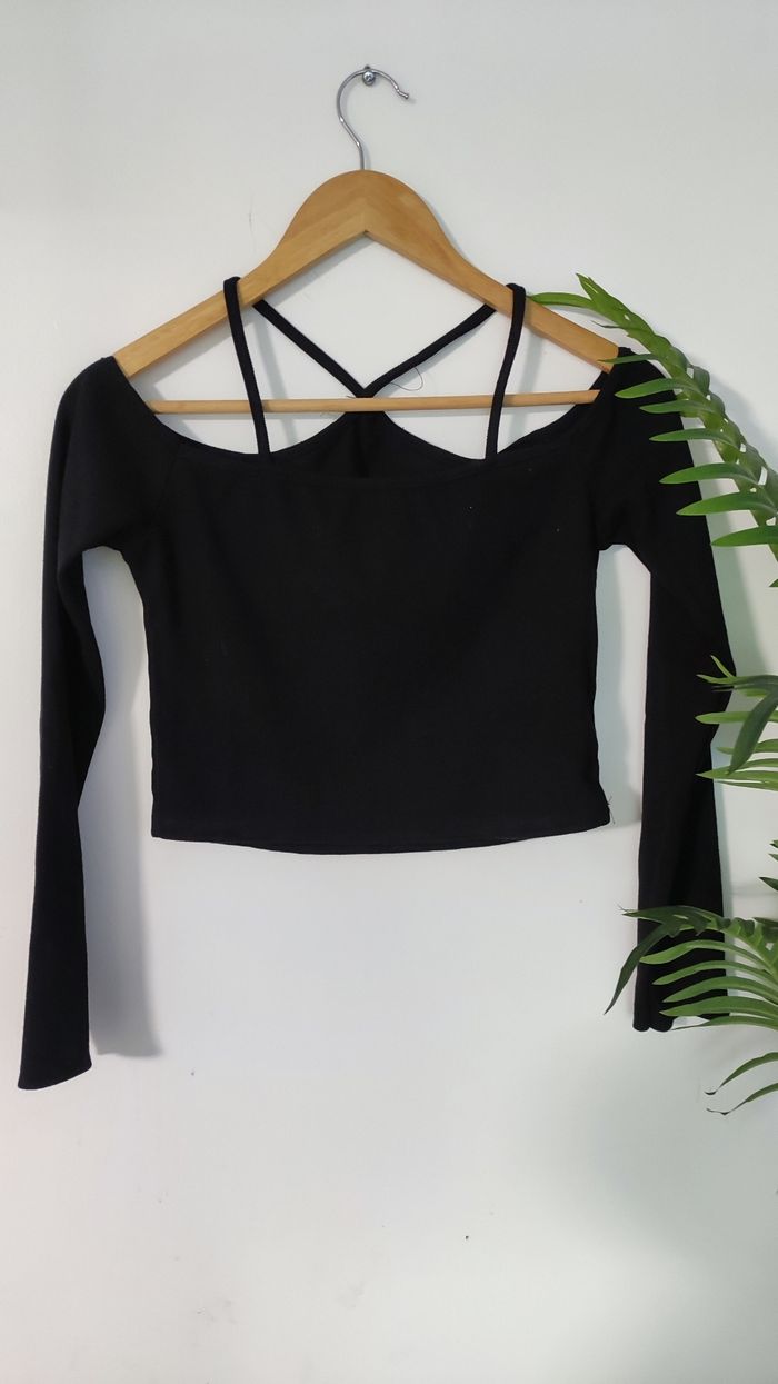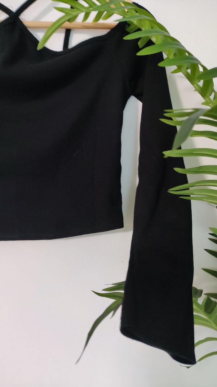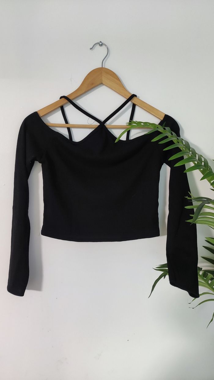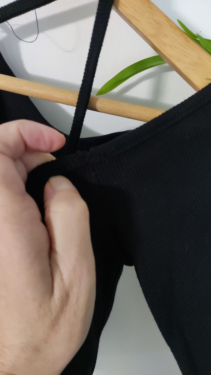 Top court épaules dénudées Noir uni Fine bretelles Taille 36-38 Matière viscose, elasthanne La couture commence légèrement avec défaire Un Mini point de couture à faire 2 point et c'est fait. Sinon complètement comme neuf.