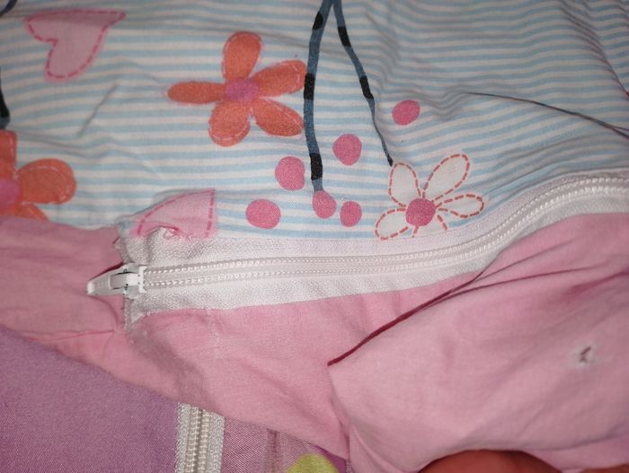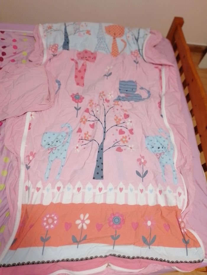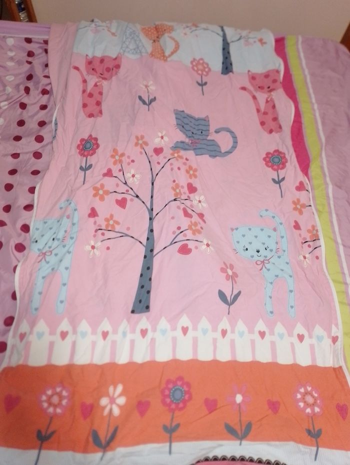 Parure prêt à dormir chats " style Caradou Verbaudet " Pour lit d'enfant Motif chats 90x190cm pour lit 1 personne Drap housse attaché par un zip ( fermeture éclair) de chaque côté de la housse de couette ce qui permet a l'enfant de dormir bien au chaud dans ses draps et non a l'extérieur du lit quand les draps sont enlever lorsque l'enfant bouge beaucoup Drap + housse de couette + taie d'oreiller Quelques petits accros, et au niveau des fermetures éclair voir les photos Vendu dans l'état Les fermetures éclair fonctionnent correctement
