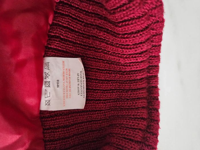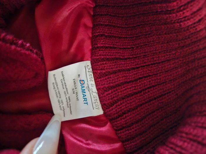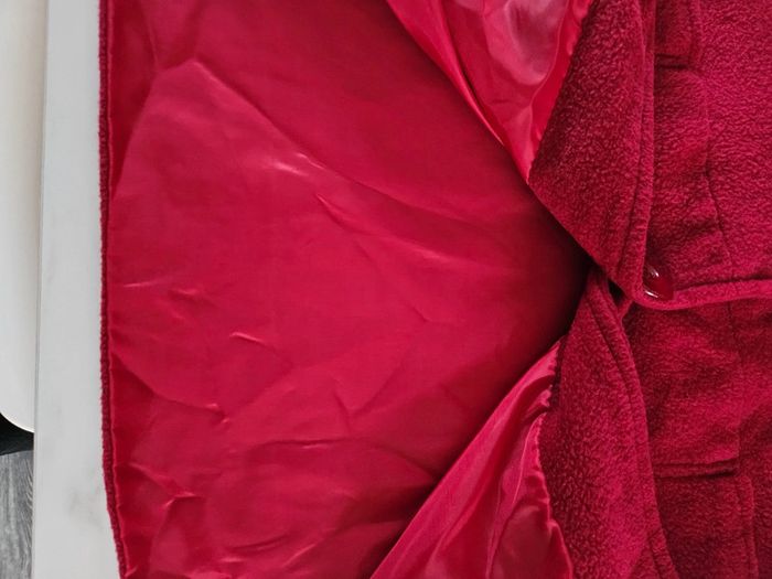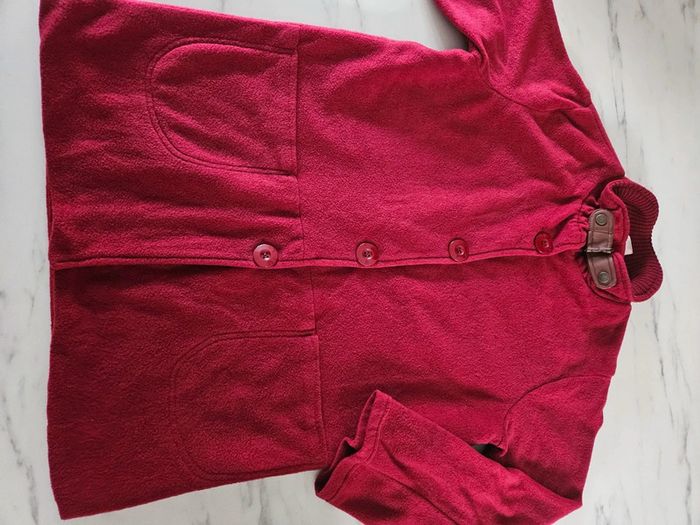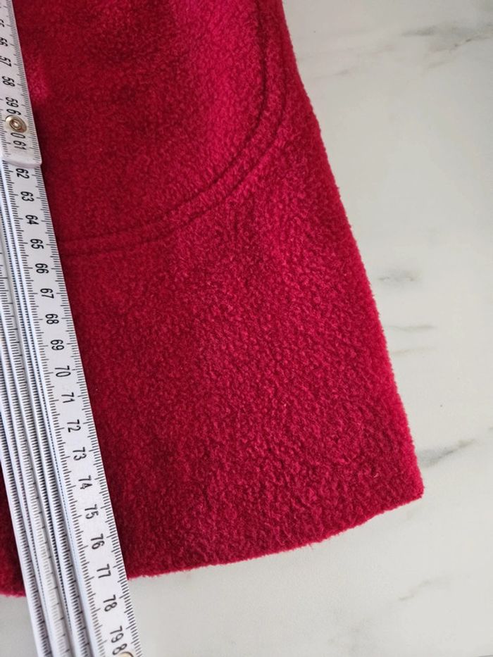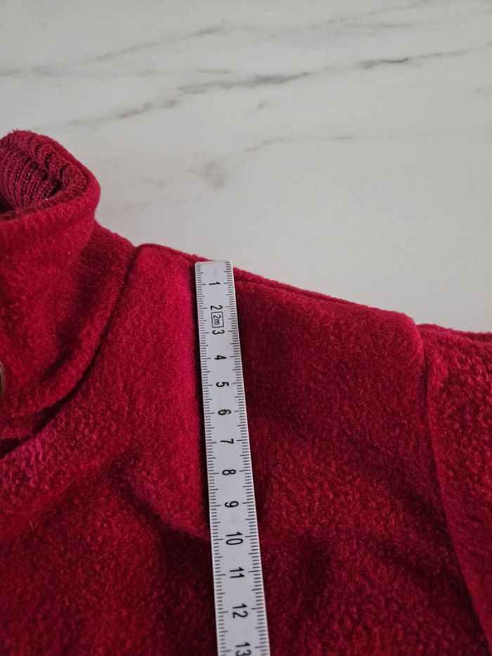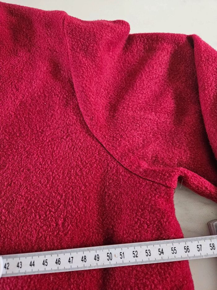 Gilet tout doux. C'est un S/M mais il taille grand Rouge un peu bordeaux. Les dimensions se trouvent sur les photos. Porte mais il reste en très bon état