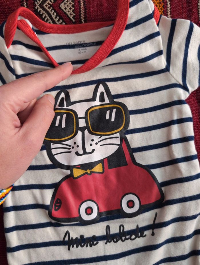 Lot de body Mixte 100% coton Un blanc jaune thème gros câlin orange bleu Un chat en voiture type marinière bords rouge