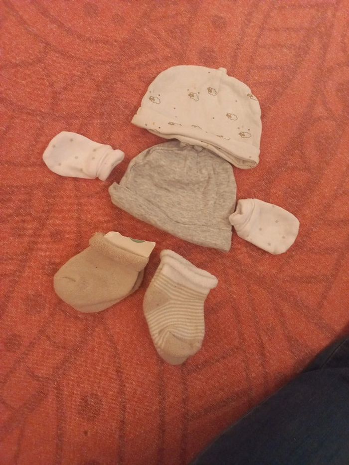 Lot 8 pièces naissance bonnets chaussettes gants coton - photo numéro 1