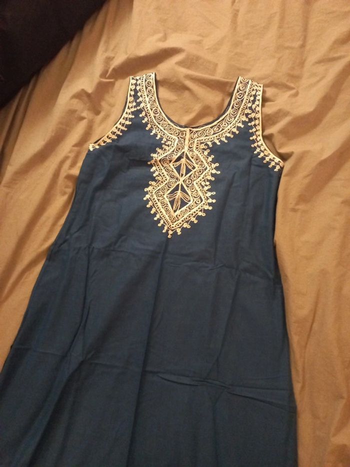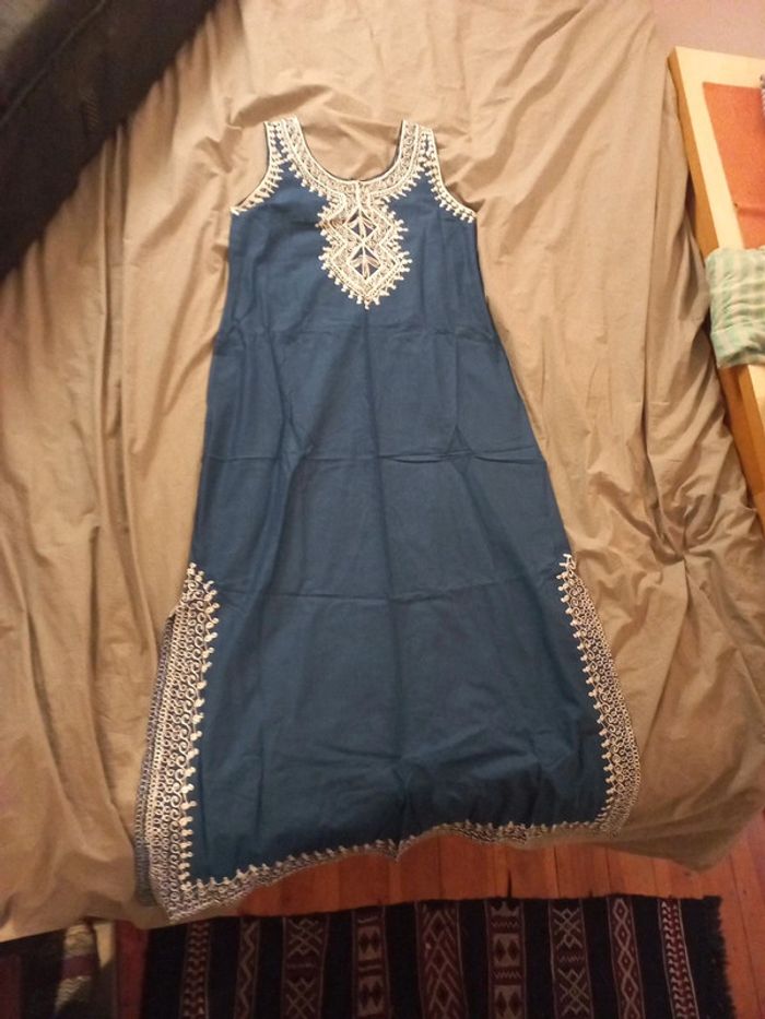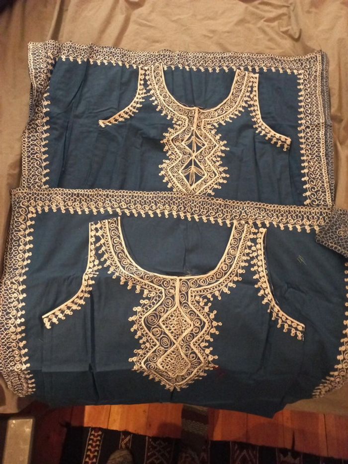 2 robes a disposition, 6 € l'unité, 11€ les deux Neuves, très belles, bleu roi, broderies raffinées blanches, légère ouverture basse sur les côtés, idéal maison ou sorties Belle également en tenue pour événement Taille unique du 38 au 44 car évasée mais magnifique J'en ai un modèle et la porte en 38 Mais évasée et adaptable a differentes morphologies, si possible poitrines pas trop fortes Achetées au Maroc par ma famille il y a 50 ans et parfaitement neuve Pièce vintage mais tissu neuf