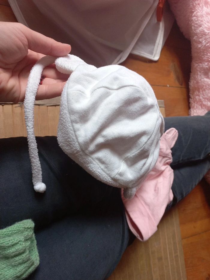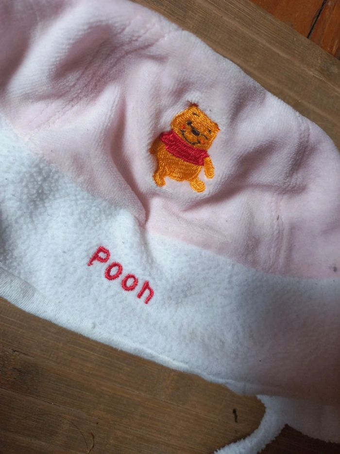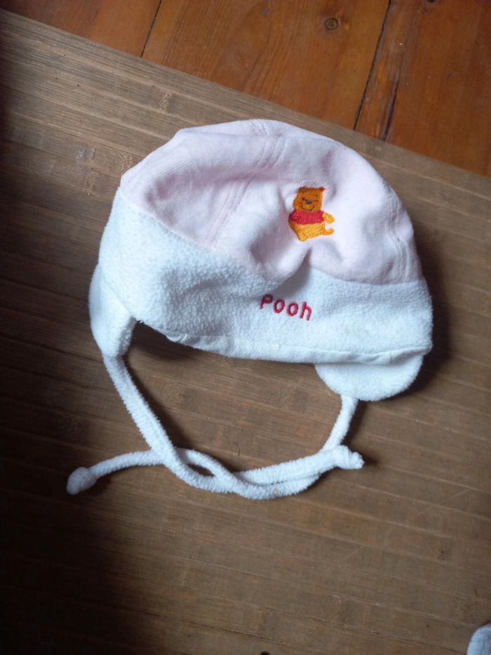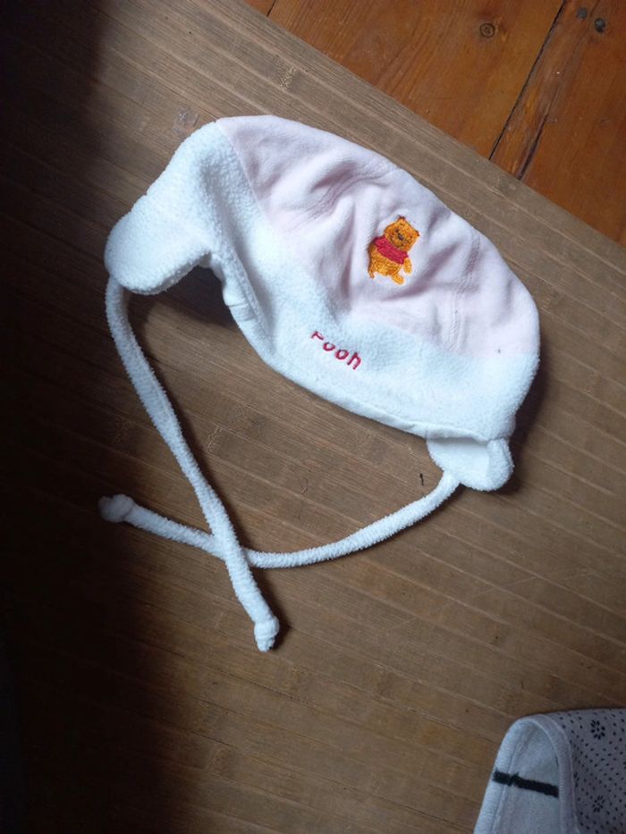 De 6 à 12 mois selon bébé Blanc et rose Doublé, tout doux Occasion mais bon état, chaud, pratique et mignon #bebefille6mois #bébéfille #bebefille9mois #bébéfille12mois #winnylourson #winnythepooh #bonnet #bonnetbebe #disney #hiver