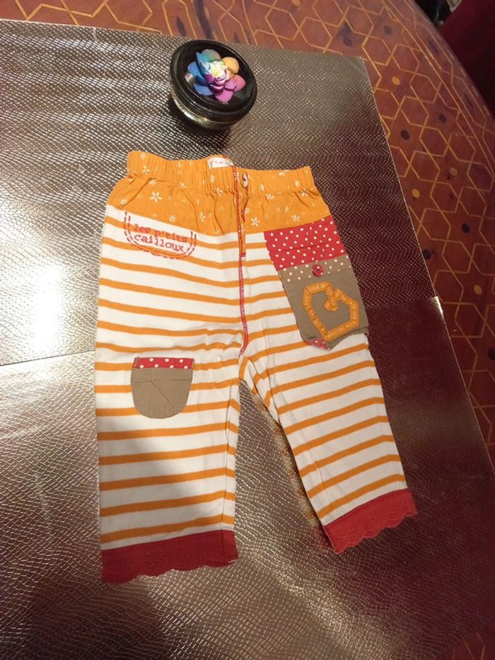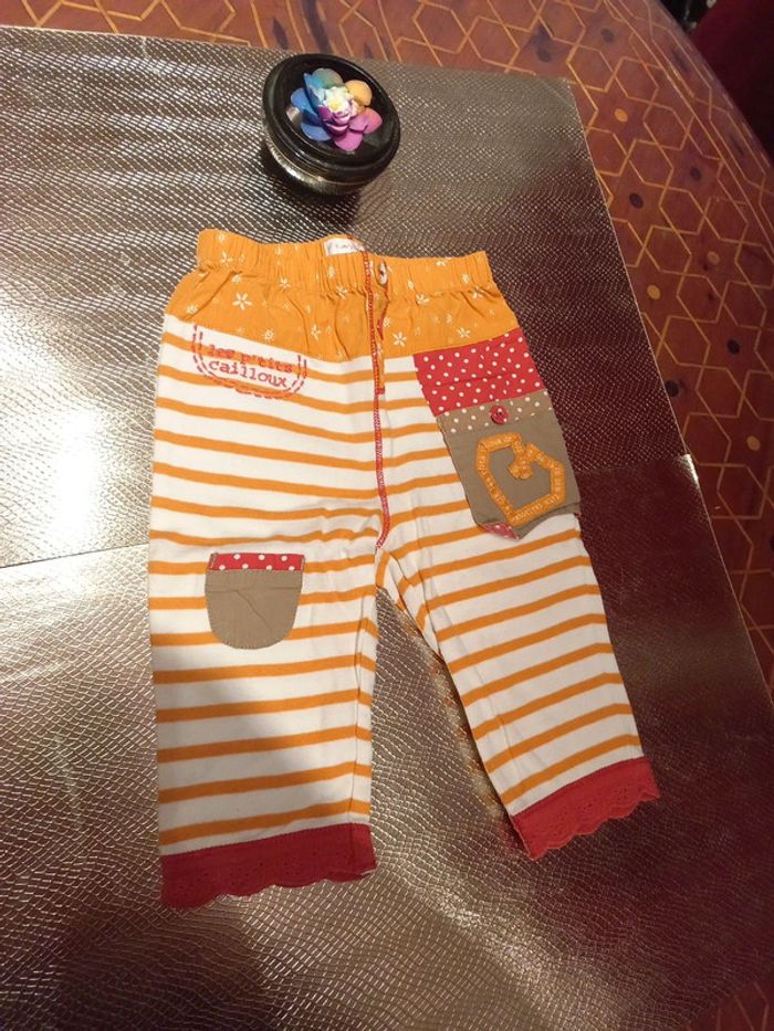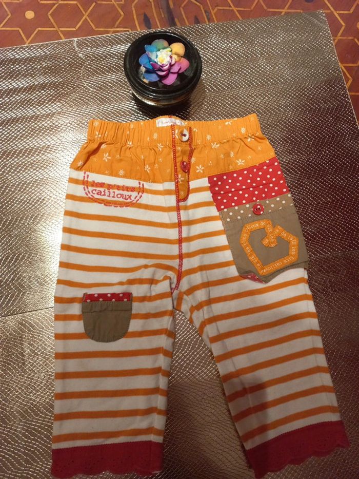 Excellent état, très beau et surtout original ! Coloris blanc orange terre rouge, dentelles aux mollets, fleurs à la taille et joli cœur avec pois sur la poche, 2 vraies poche, system jegging De 9 à 12 mois #bebefille6mois #bébéfille #bebefille9mois #bébéfille12mois #