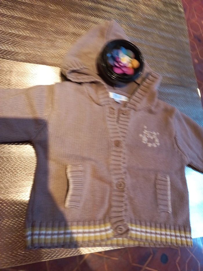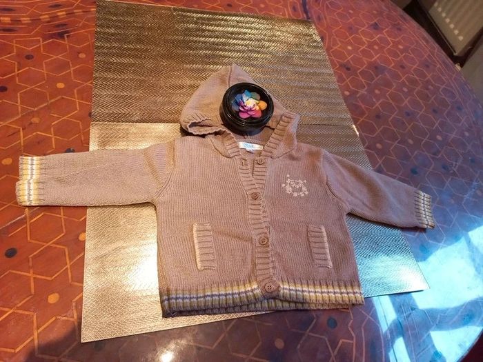 Bon état, marron terre et vert pomme / blanc Ouverture par boutons et capuche Pratique et sympa, couleurs passe partout #bebefille6mois #bebefille9mois