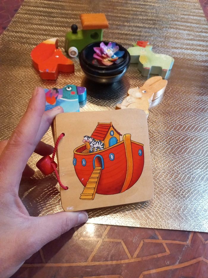 Bon état et beaux objets Renard rouge , canard bleu , certf vert, train à roulettes vert et Livret arche de noe en bois Goki #bébéfille #bebegarcon #jouets