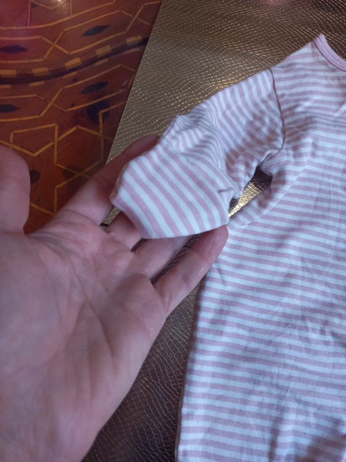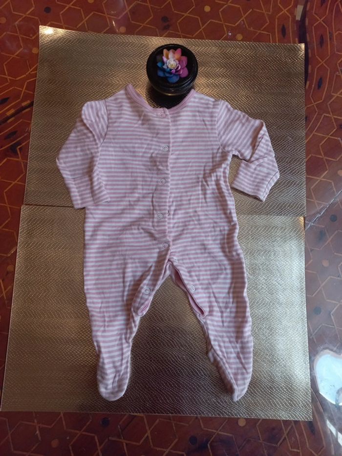 Rayé rose et blanc Pratique car pressions devant et dessous Plus mains au chaud possible (fermeture des mains) Léger halo au col presque pas perceptible (photo) #bébéfille #bébéfille1mois #bébéfillenaissance