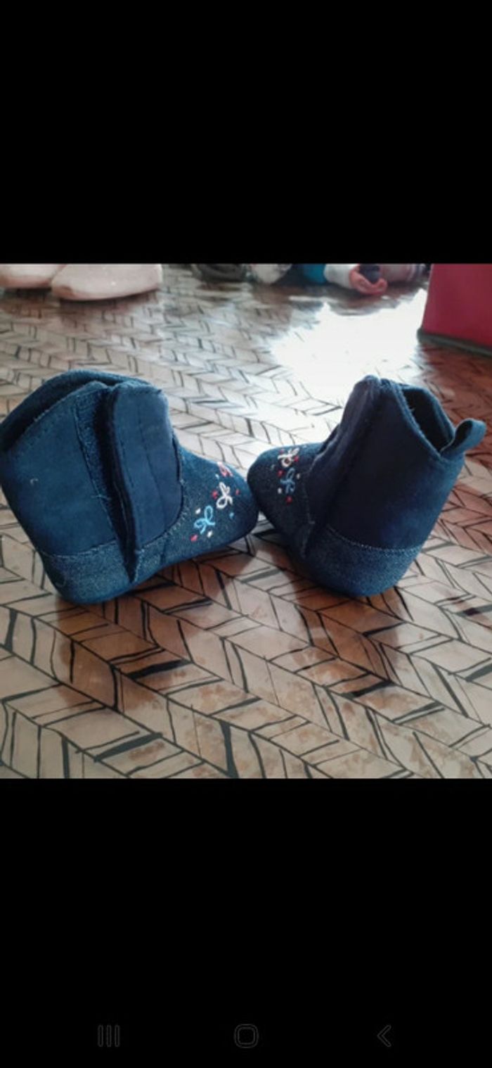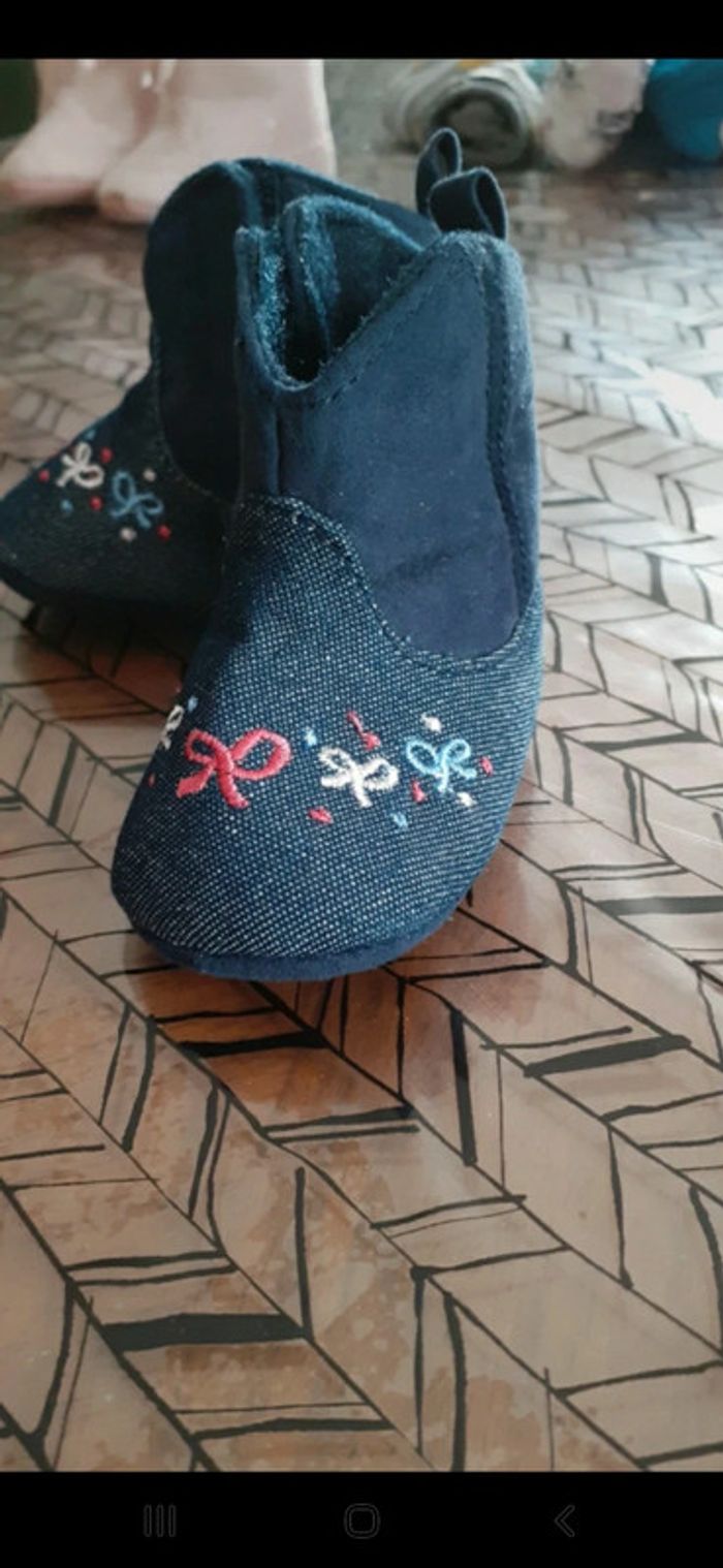 Chaussure style bottine Couleur jean et bleu marine Facilité de mise aux pieds avec scratchs Neuf, on voit encore l'emplacement de l'étiquette Taille 0/3mois environs