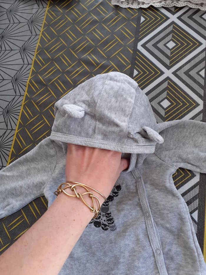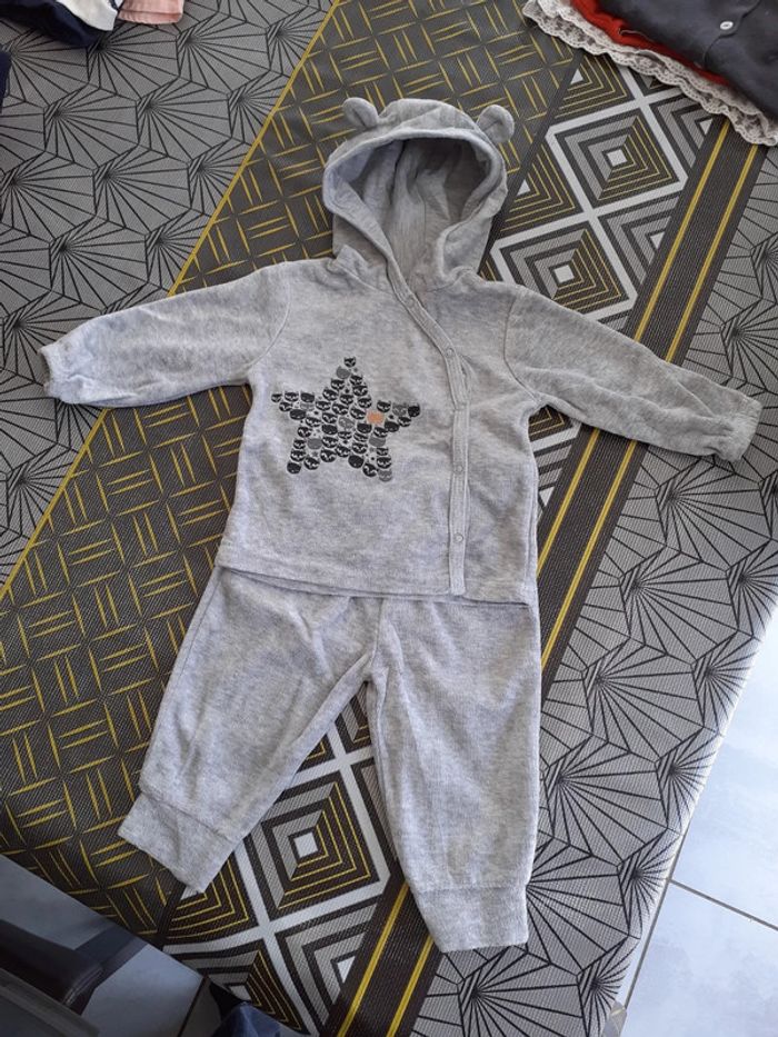 Ensemble pantalon avec haut. Haut style gilet avec capuche et petites oreilles Marque kimadi taille 6 mois Très bon état, dessin légèrement craquelé Resuction sur les lots