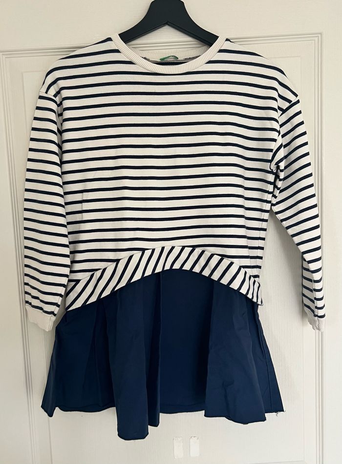 Robe à manches longues, haut type sweat-shirt blanc à rayures bleues, jupe courte. En excellent état, aucune tâche ni trou. Longueur totale 70 cm. En coton. Taille 12 ans, marque United Colors of Beneton. Envoi rapide et soigné, réduction automatique dès 2 articles sélectionnés. Mes autres ventes ici: #12ansfilleugolola #12ansfille #fille12ans #robe12ans #benetton #unitedcolorsofbenetton #robebenetton12ans