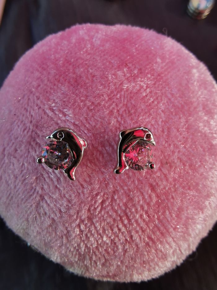 Boucles d'oreilles argentées dauphin avec strass blanc, neuves jamais portées