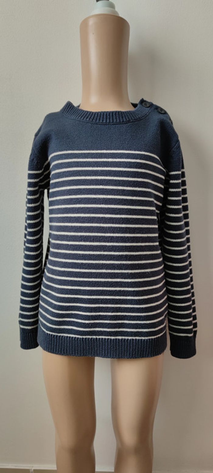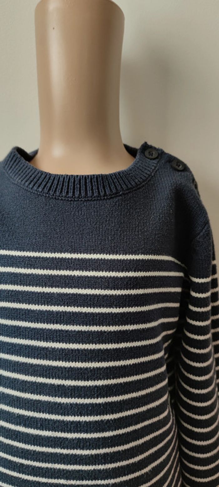Pull marinière bleu marine à rayures blanches. Ouverture boutonnée épaule - T. 6 ans * TRÈS BON ÉTAT *