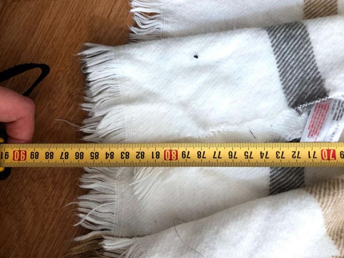En bon état Assez grande et chaude (Double de ces dimensions car pliée) Il y a des bouloches mais peuvent s’enlever avec l’apreil et pas si visibles