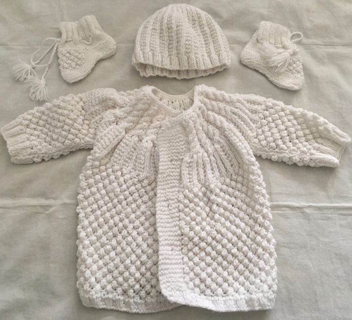 Ensemble en laine fait main composé d’un gilet, d’un bonnet et d’une paire de chaussons en très bon état #hbipuericulture