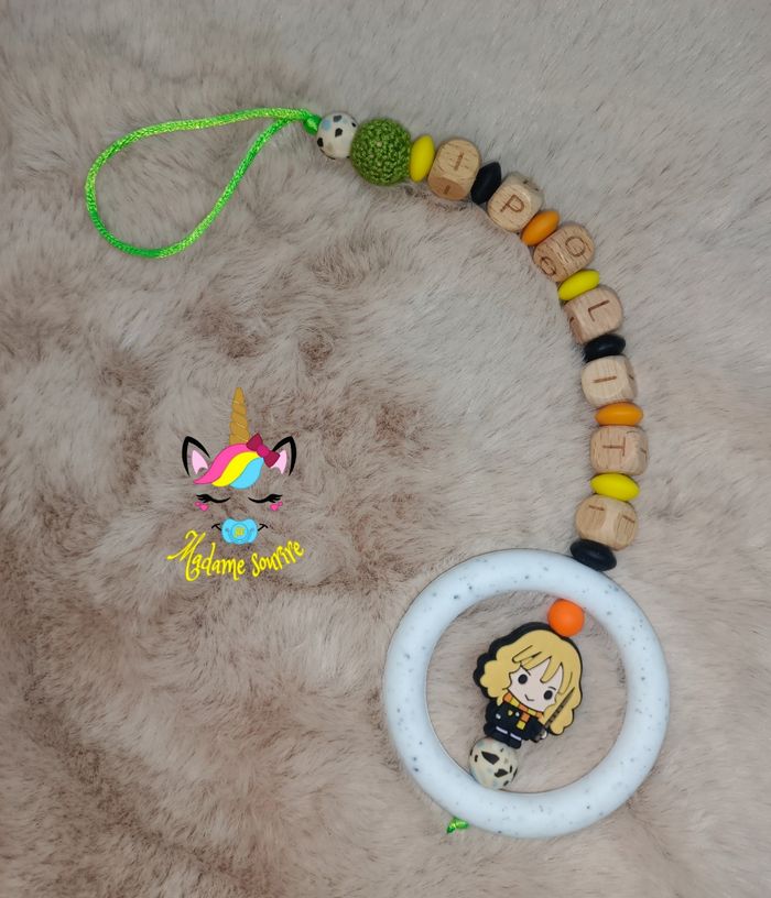 Une attache tétine dentition Hermione Harry Potter avec une boucle pour attacher la tétine et à l'autre bout un anneau dentition pour que bébé mâchouille et ainsi soulager ses poussées dentaires ou il peut servir à nouer doudou.