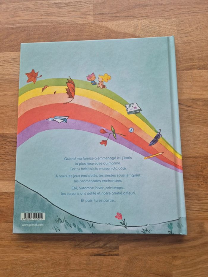 L’amitié, la première histoire d’amour des enfants.Qu’est-ce qui distingue une histoire d’amour d’une histoire d’amitié ? Pas grand-chose, finalement... « Quand ma famille a emménagé ici, j’étais la plus heureuse du monde. Car tu habitais la maison d’à côté. À nous les jeux endiablés, les siestes sous le figuier, les promenades enchantées. Été, automne, hiver, printemps... les saisons ont défilé et notre amitié a fleuri. Et puis, tu es partie... »