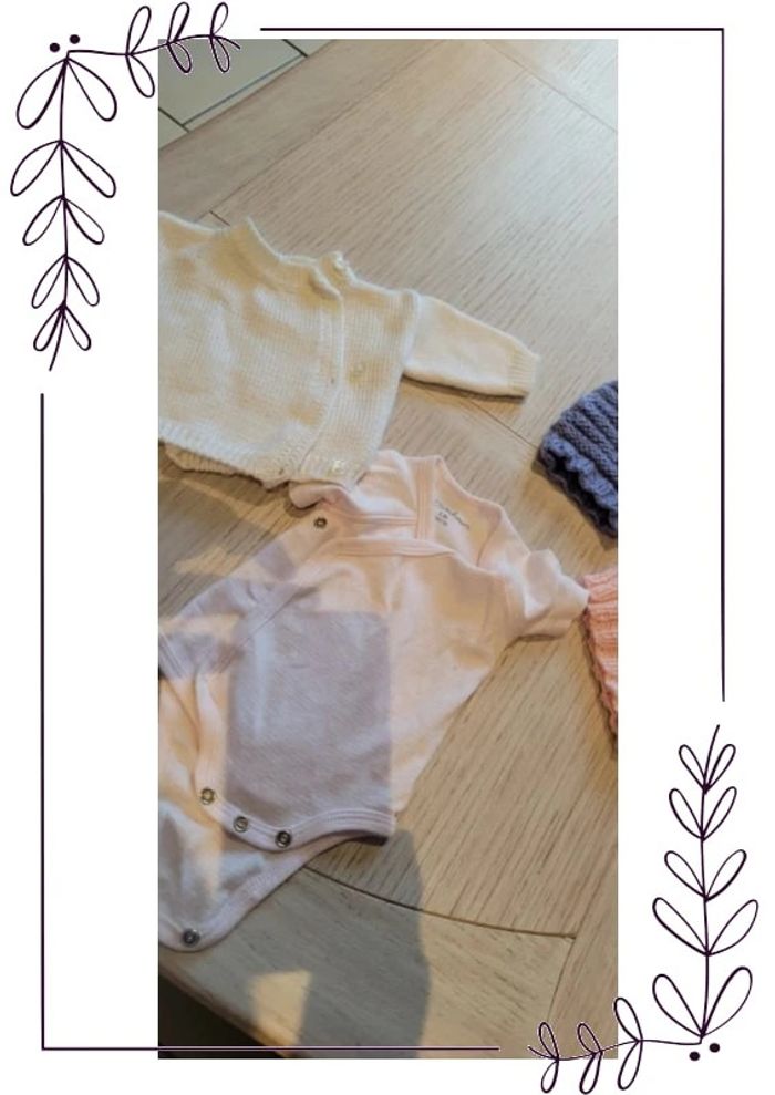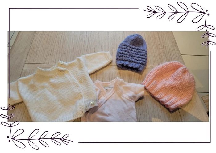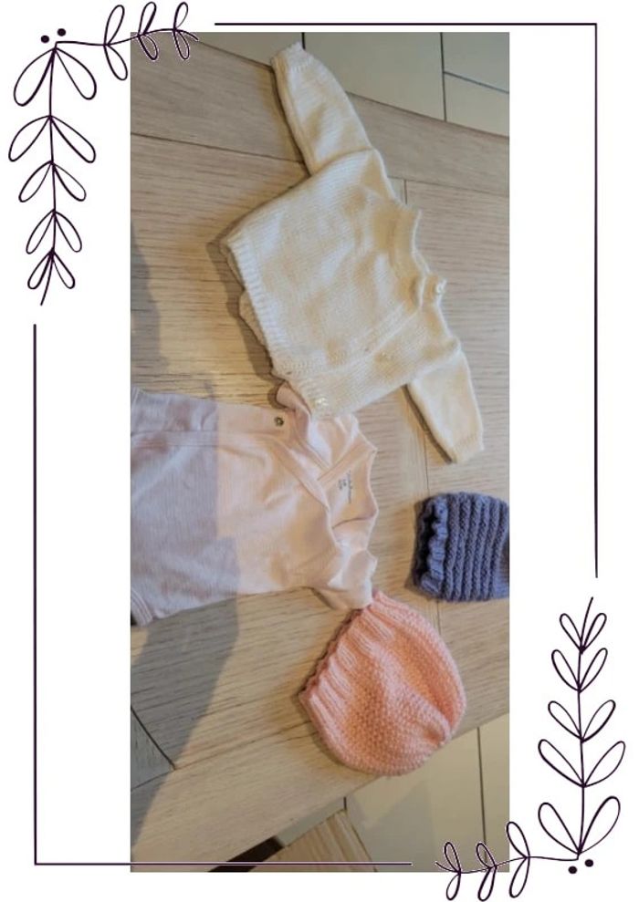Vêtements pour poupon 1 body + 1 veste + 2 bonnets (fait main et maison !). Très bon état. #33coco_jouet