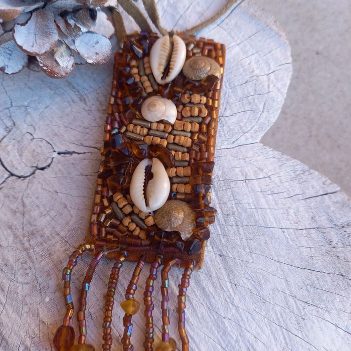 Joli pendentif vintage artisanal dans les tons de marron beige orangé Longueur totale 14 cm/4 cm