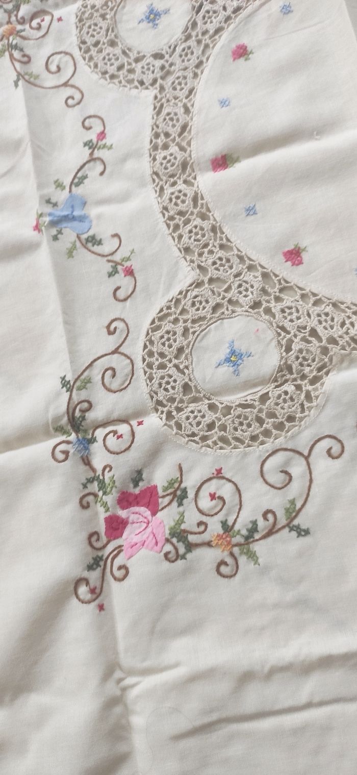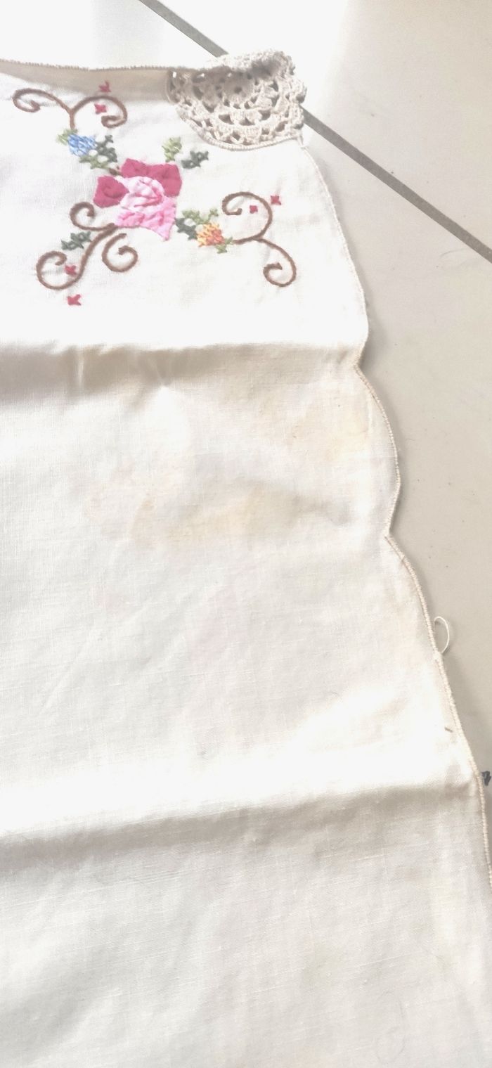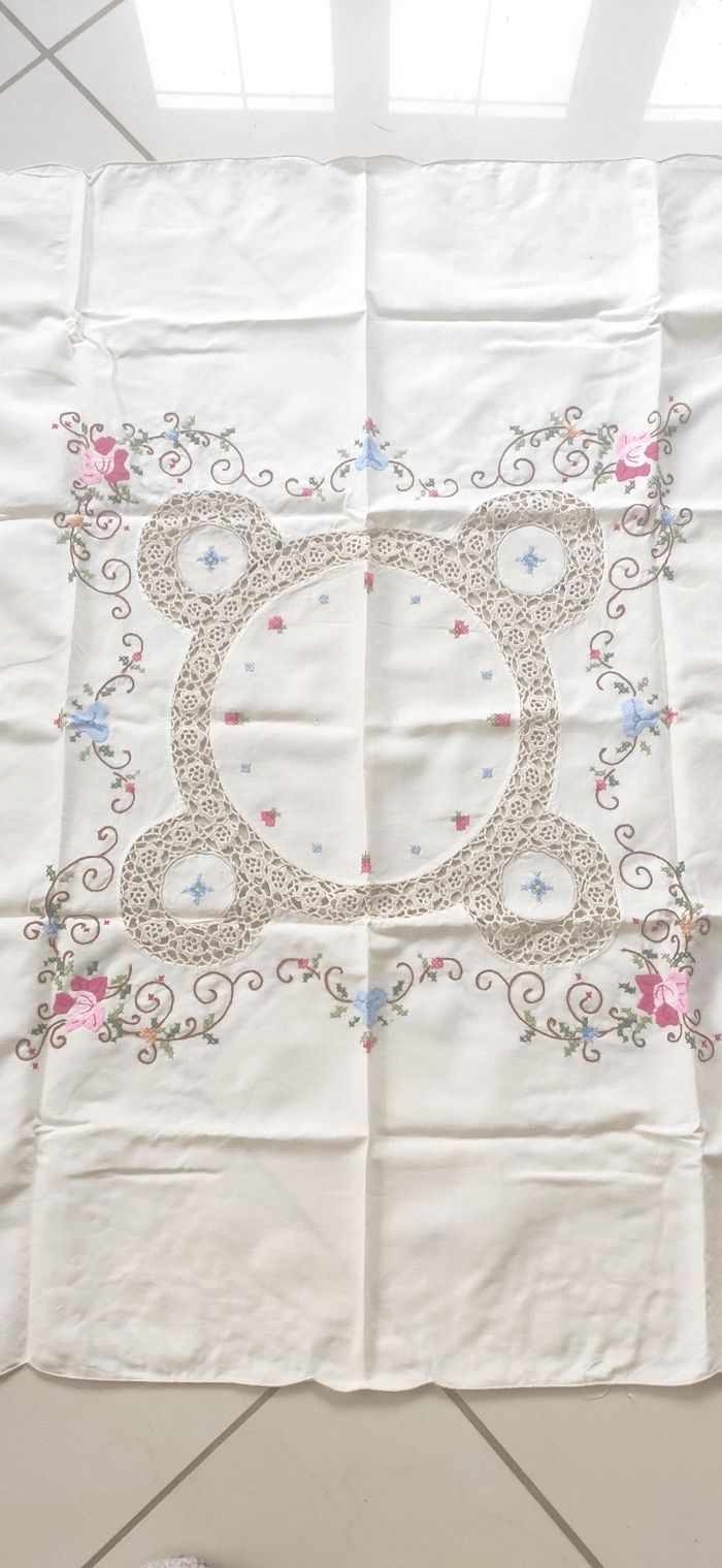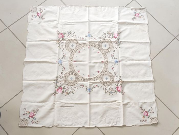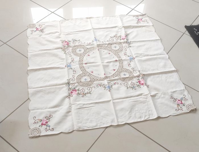 Superbe petite nappe brodée mains avec fleurs. Matière coton ou lin (je ne sais pas). 82cm x 82cm (Petite tâche claire voir photo).