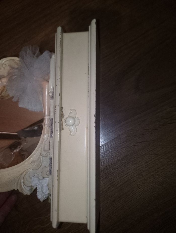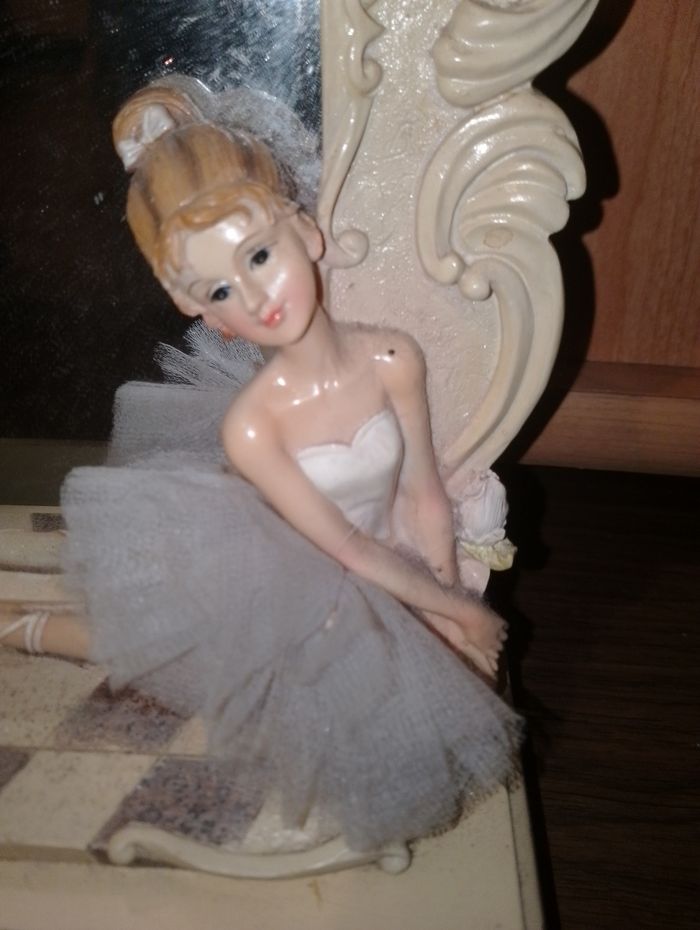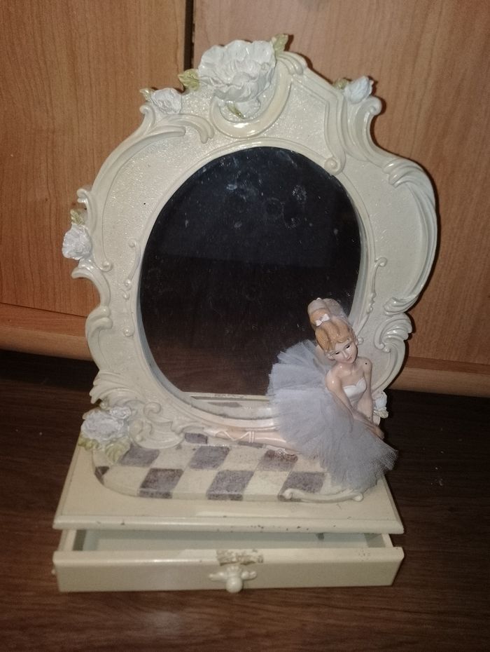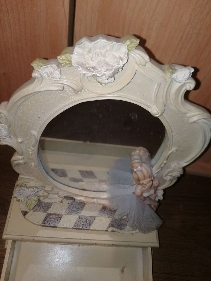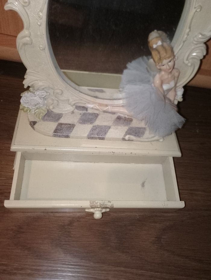 Boîte à bijoux avec 1 tiroir et un miroir avec une danseuse étoilé en tutu. Vendu dans l'état hauteur 35 cm largueur 25cm profondeur 10 cm