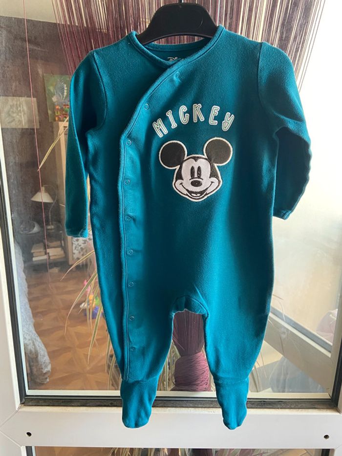 Grenouillère coton, manches longues, bleu pétrole, broderie tête de Mickey. Fermeture par boutons-pression de haut en bas