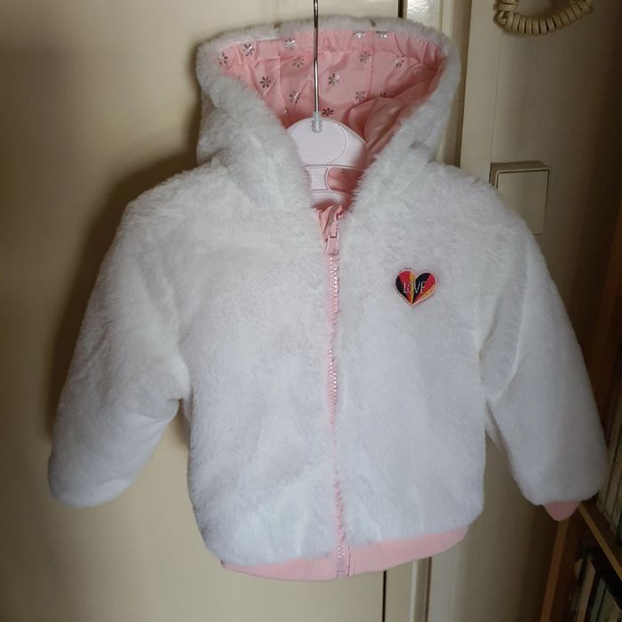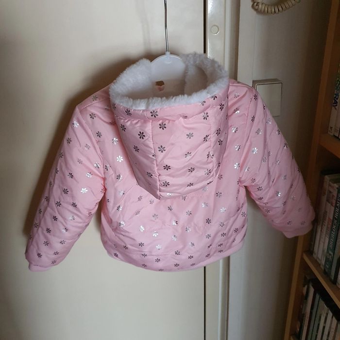 Manteau réversible 12-18 mois avec capuche Un coté rose avec fleurs argentés, un coté peluche Jamais porté