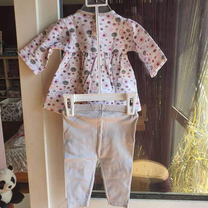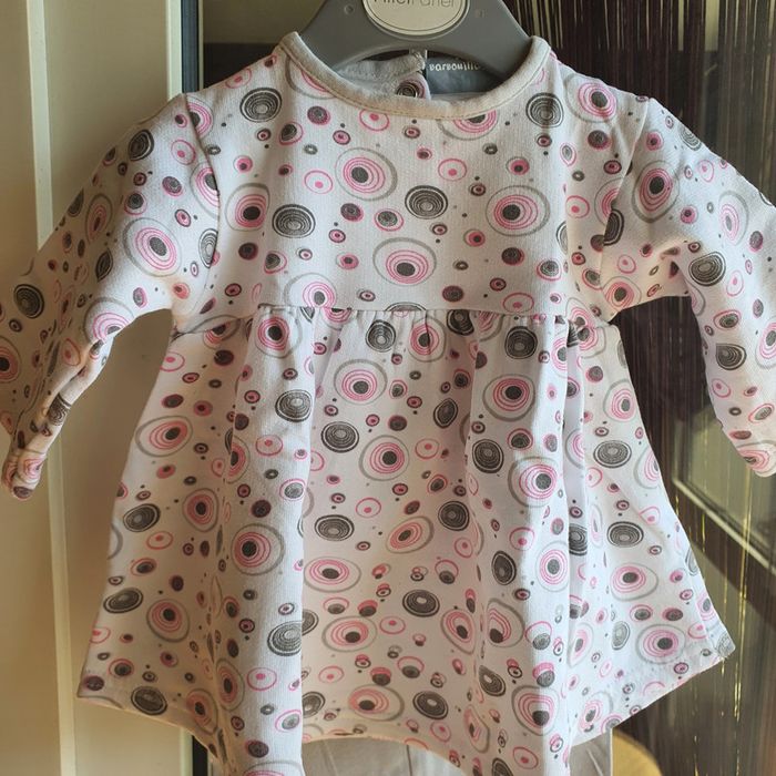 Robe manches longues, fermeture dos par pressions avec legging gris.