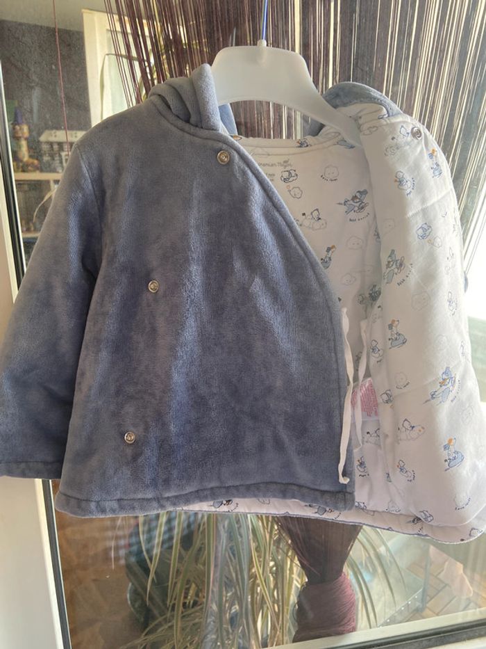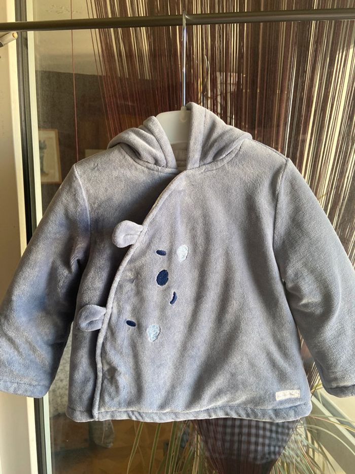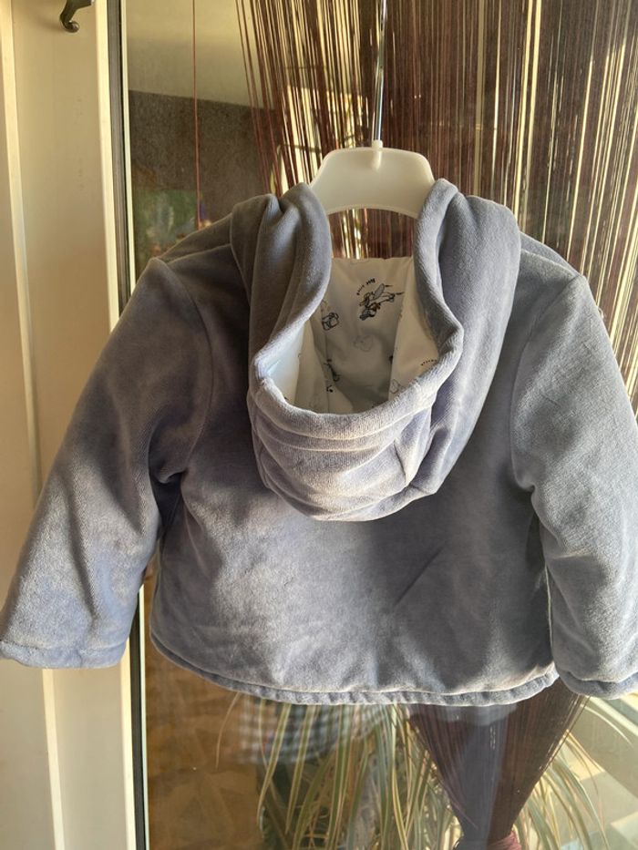 Veste à capuche bleu en velours. - Manches longues - Ouverture à boutons pression sur le devant - Motif brodé Ourson - Doublure imprimé ourson