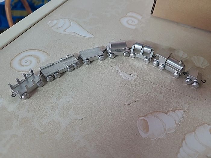 Chaque pièce a 4 roues de travail et un crochet et une boucle pour connecter les voitures dans n’importe quel ordre. Fait d’aluminium robuste. En excellent état sans aucun dommage.