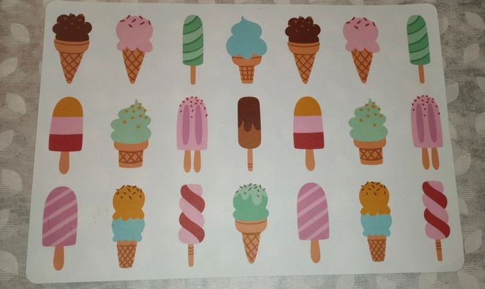 Set de table plastique, motif glaces. Neuf, jamais servi. Peut également servir pour activités manuelles..
