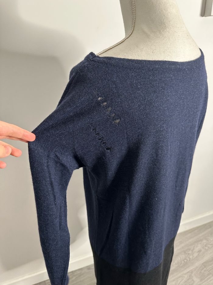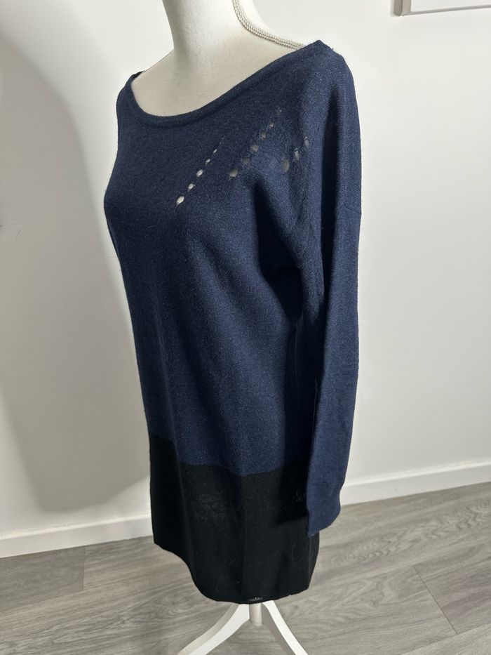 Robe pull - Excellent état - Taille 40 équivalent L - Bleu marine et noire - Ultra douce et chaude - Manches longues - Ajourée par endroits - Col rond large - Acrylique et laine Dimensions: - 56cm niveau aisselles - 90cm de long