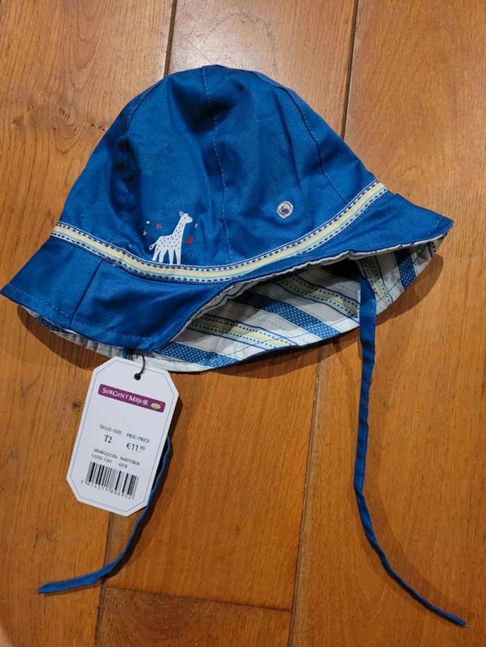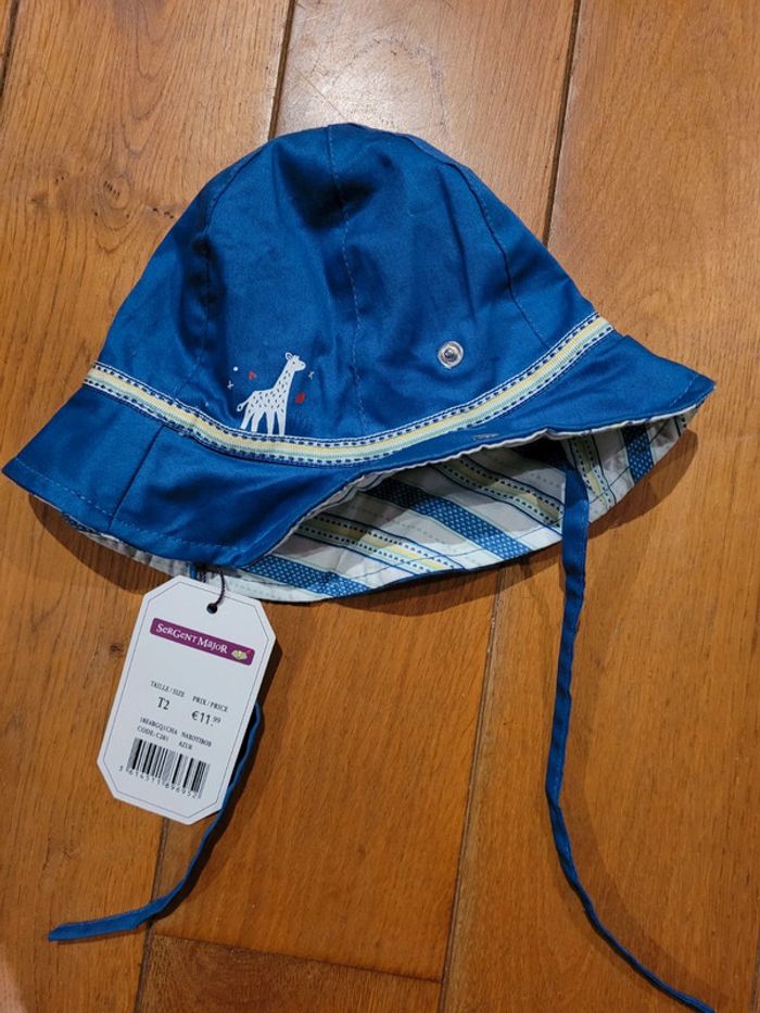 Chapeau / bob bleu bébé Motif girafe Taille 6/9 mois Avec pression pour soulever le devant du chapeau pour ne pas embêter bébé. Neuf jamais porté #6moisgarconzhabou