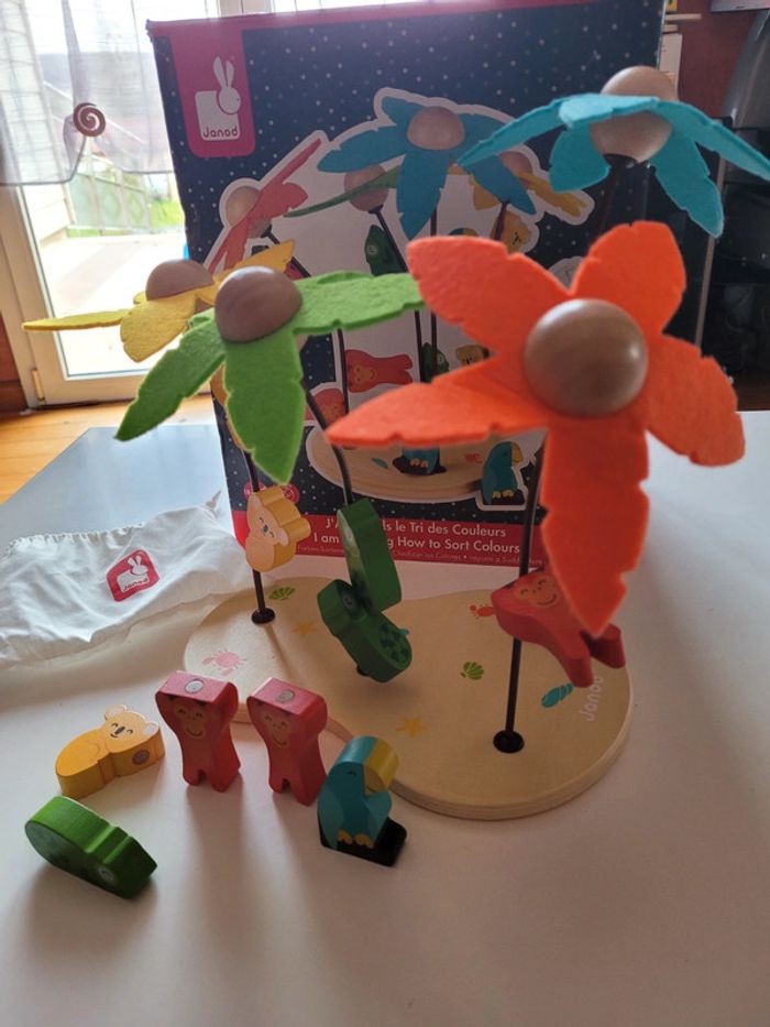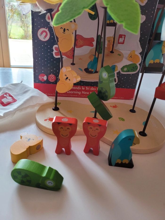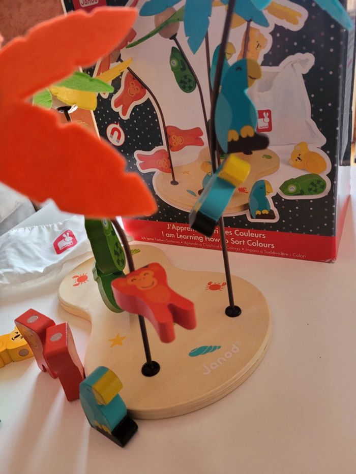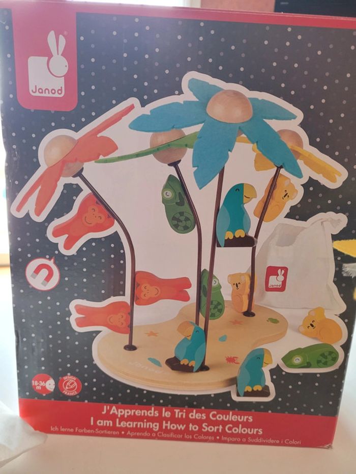 J apprends le tri des couleurs - ile aux cocotiers de Janod Une belle île paradisiaque composée de 4 arbres et 12 animaux magnétiques.L'enfant apprendra le tri des couleurs en venant placer chaque animal sur l'arbre de la bonne couleur. Sac coton inclus, très pratique pour ranger toutes les pièces Peu servi. De 18 à 36 mois