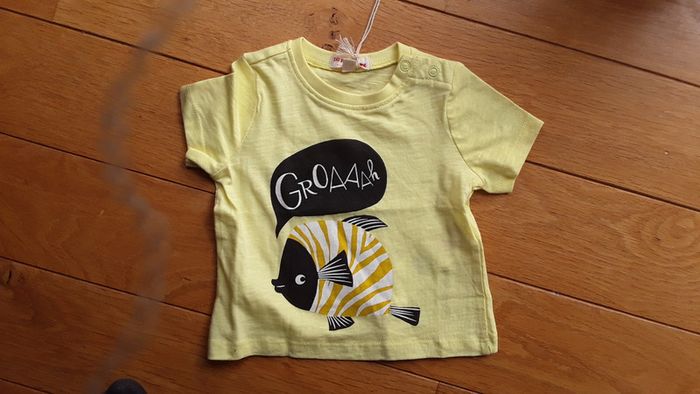 T shirt manches courtes jaune motif poisson Neuf mais reçu sans etiquette Taille 6 mois #6moisgarcon #6moisgarconzhabou