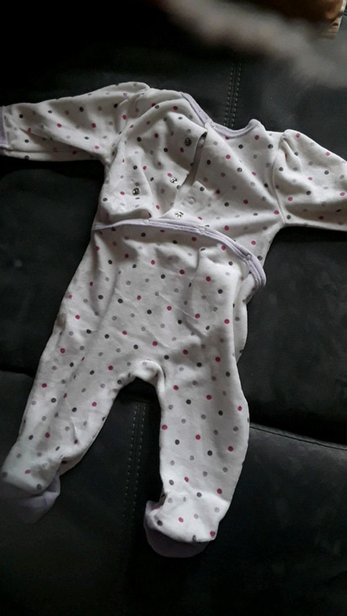 Pyjama chaud ėcru avec pois roses et mauves. Fermeture par pressions au dos. Taille 6 mois #6moisfillezhabou
