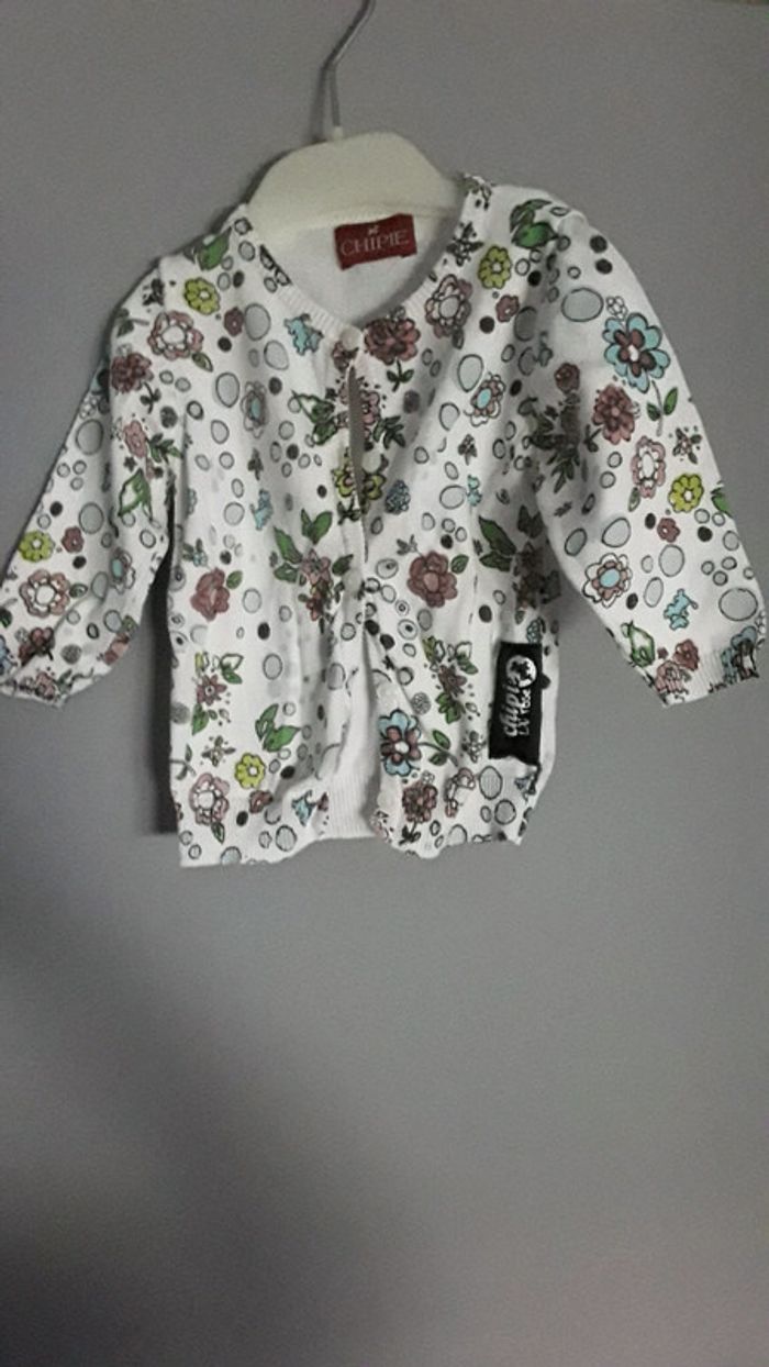 Gilet boutonné blanc avec motifs fleurs et chiens. Taille 6 mois