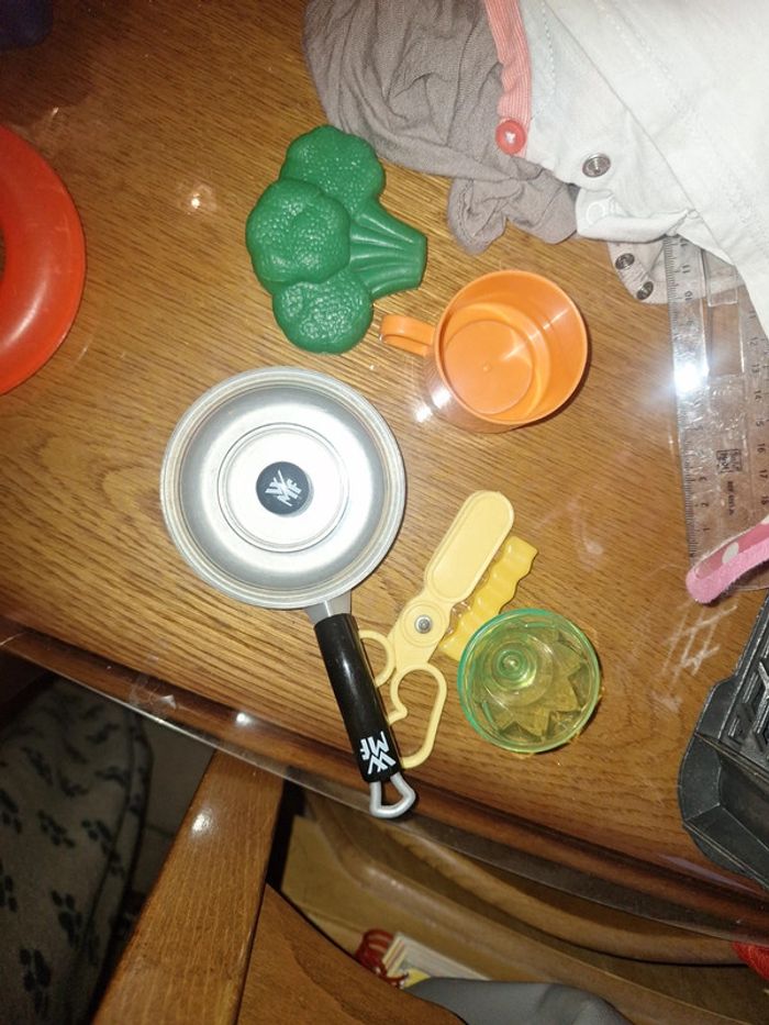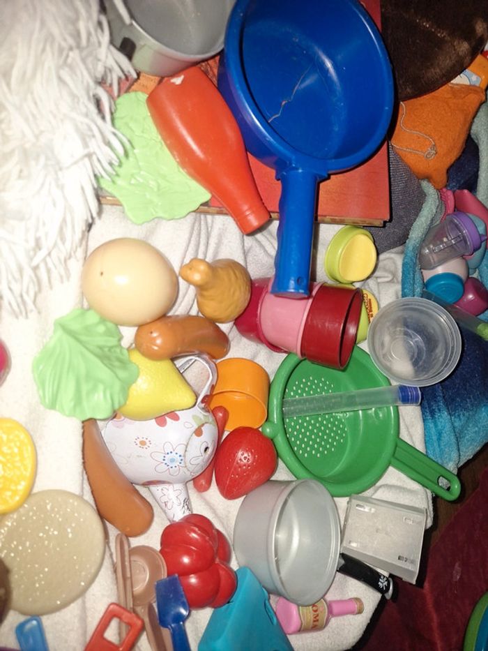 Composé de Salade steak œuf tomate fraise poulette saucisse ketchup Cuillère 1 Ciseau jouet 1 frite Une petite coupelle Choux 1 assiette 4 tasses poêle et une avec couveecle marque klein grise. Passoire casserole Très bon et bon etat #zaceci28jouet Lot de 44 articles Énorme lot