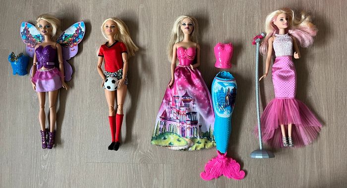 Barbie papillon avec ces 2 corsets : 8€ Barbie football et son ballon : 8€ Barbie sirène avec sa queue et son corset : 8€ Barbie chanteuse karaoke : 8€
