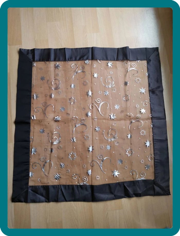 Chemin de table réversible neuf 85x85xm Motifs dorés ou argentés selon la face Organza 100% polyamide Bordure 100% polyester
