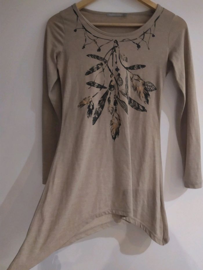Tunique asymétrique dont les côtés sont un peu plus longs que le reste. Dessin de plumes dorées sur la poitrine. Très légèrement bouloché mais ça ne se remarque pas.