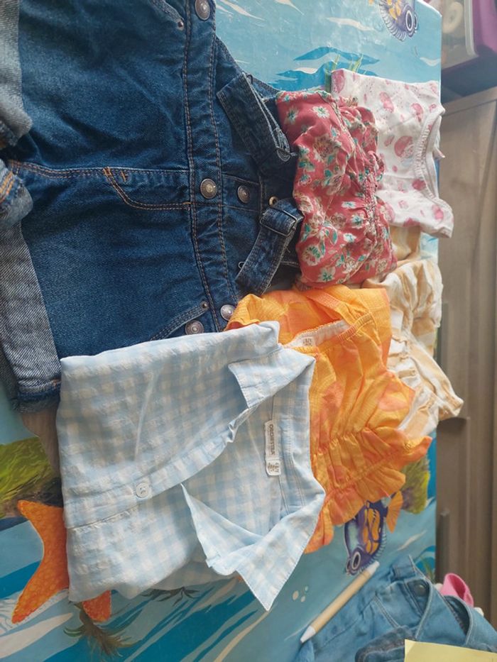 Lot été diverses marques. Portés. Encore tres bon etat general Lot de : 1 short salopette 1 Tee-shirt et son pantalon 1 haut et son short 1 Tee-shirt manche courte 1 debardeur 1 tunique " caisse 13"