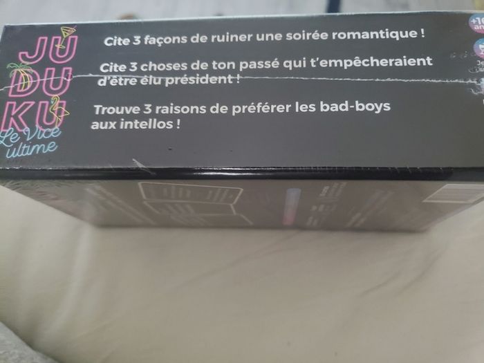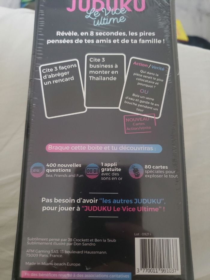Neuf, sous blister. N'hesitez pas à faire des lots. JUDUKU est LE jeu qui pimente tes soirées à l'aide de questions hilarantes à répondre en moins de 8 secondes. NOUVEAU dans ce Tome 3 des cartes ACTION ou VÉRITÉ REGLES SIMPLES & EFFICACES : Un joueur pioche une carte et pose la question à son voisin Il doit alors y répondre en moins de 8 secondes (pas le temps de réfléchir !) Si les réponses sont validées, le joueur marque 1 point. Le premier joueur à 7 points est le vainqueur !Si vous pensiez connaître vos amis, vous n'avez sûrement pas encore vu leurs pires pensées se révéler grâce à cette version Sea, Friends & Fun: 480 cartes pimentées, gages et actions/vérités délirants comme il le faut. PARFAIT POUR L'APÉRO : Ambiance tes soirées, week-ends, EVG/EVJF, anniversaires avec un jeu hilarant qui mettra l'ambiance à coups sûrs (et qui révèlera des petits secrets ... UN JEU TOUT PROPRE : Cartes fabriquées en France & ECOFRIENDLY : papier écoresponsable et un % des bénéfices est reversé à des associations caritatives.