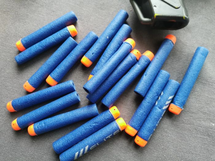 Jouet mitraillette jaune Nerf avec les munitions en mousse 18 pièces. Mitraillette jaune N-strike, en très bon état général, en plastique, les munitions sont un peu marquées. Poids du lot 615g. #jouetmitraillette #nerf #nstrike #munitions #jouetnstrike