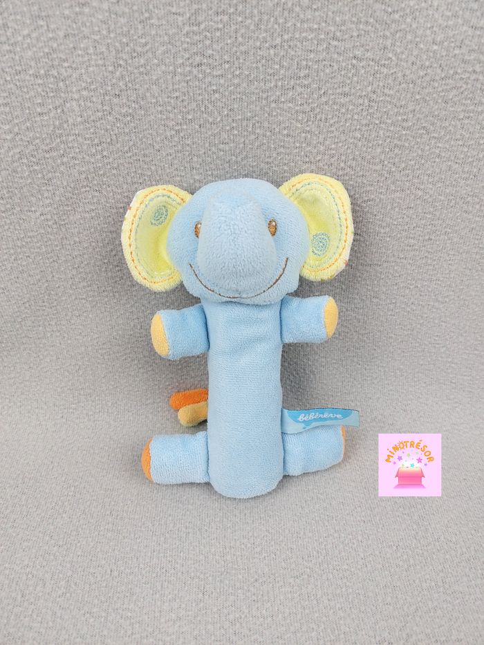 Peluche doudou éléphant bleu vert orange Pouet Pouet 18 cm Bébérêve Très bon état - étiquette blanche derrière la bleue effacée Envoi rapide Réf A10622