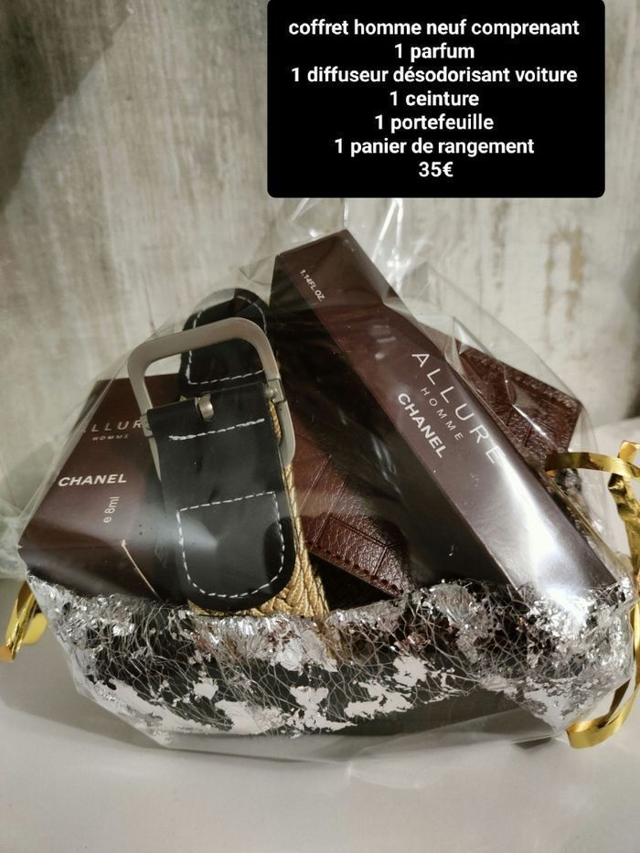 Coffret homme neuf comprenant 1 parfum 1 diffuseur désodorisant voiture assorti au parfum 1 ceinture 1 portefeuille