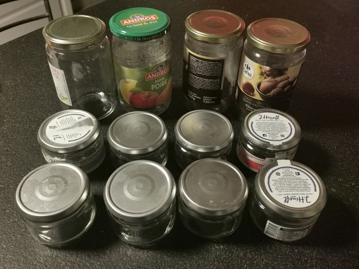 Pots en verre avec couvercle 1 grand de contenance 748 ml 1 grand de contenance 738 ml (compote Andros) 2 de contenance 720 ml 8 de contenance 235 ml Pour divers conservations ( sucre, farine, fruits secs, confiture, gelée, miel, etc...)